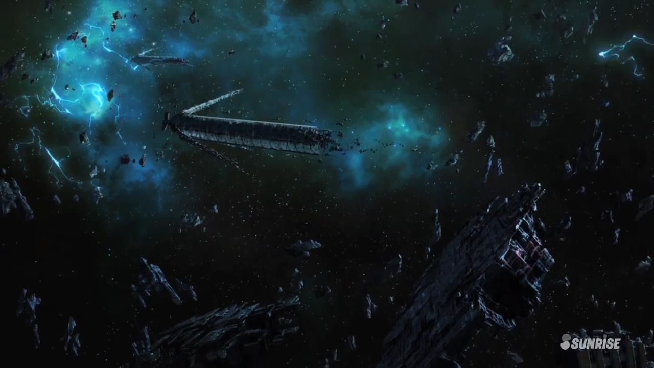 Concernant l’histoire, je pourrais faire tout un paragraphe sur la place qu’occupe Thunderbolt dans la saga Gundam mais je sais très bien que vous vous en foutez complètement. De toute façon ça n’a pas d’importance, le contexte choisi (le début de l’Universal Century) ne sert que d’excuse pour expliquer que deux factions ennemies se fassent la guerre à coups de robots géants. L’anime se déroule dans le Secteur Thunderbolt, un amas de ruines spatiales qui sert de route de ravitaillement pour les flottes de Zeon, et que la Fédération Terrestre cherche à reprendre. Les régiments de Zeon stationnés sur place sont composés de rebus de l’armée ; vieillards, gamins inexpérimentés et estropiés de guerre. Abandonnés par leur hiérarchie, ils vont devoir se défendre face aux assauts de la Fédération, qui est par ailleurs équipée d’un tout nouveau mecha, le Full Armor Gundam.